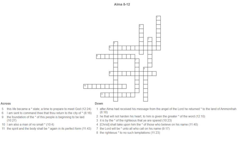 Alma 8-12 0 June 8, 2020 Written by Kristi Click on the link below to download the crossword. The numbers at the end of each hint indicate the chapter and verse in which the answer can be found. alma8_12Download Share this: Share on X (Opens in new window) X Share on Facebook (Opens in new window) Facebook Like Loading... Related