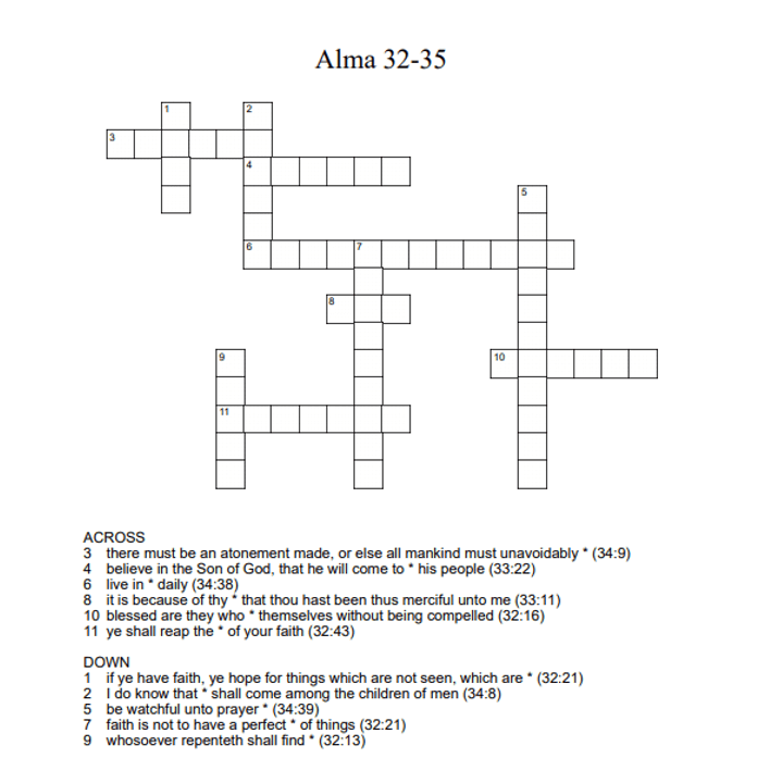 Alma 32-35 0 July 12, 2020 Written by Kristi Click on the link below to download the crossword. The numbers at the end of each hint indicate the chapter and verse in which the answer can be found. alma32_35Download Share this: Share on X (Opens in new window) X Share on Facebook (Opens in new window) Facebook Like Loading... Related