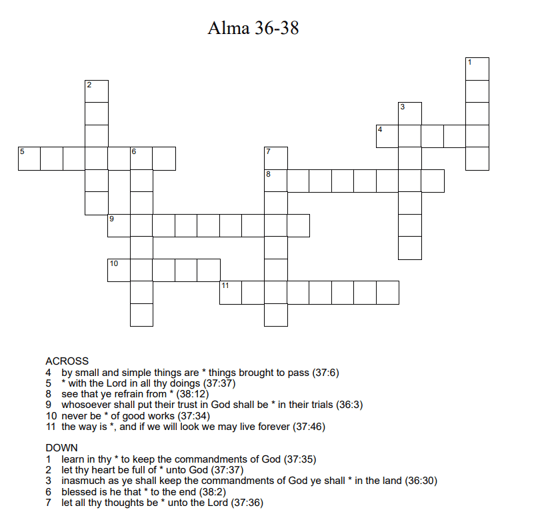 Alma 36-38 0 July 19, 2020 Written by Kristi Click on the link below to download the crossword. The numbers at the end of each hint indicate the chapter and verse in which the answer can be found. alma36_38Download Share this: Share on X (Opens in new window) X Share on Facebook (Opens in new window) Facebook Like Loading... Related