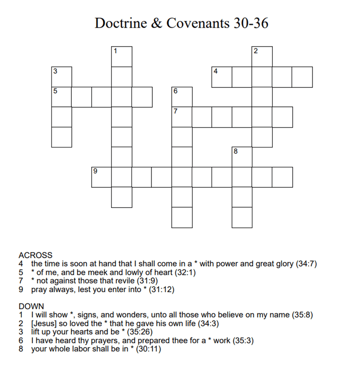 Doctrine & Covenants 30-36 0 April 5, 2021 Written by Kristi Click on the link below to download the crossword. The numbers at the end of each hint indicate the chapter and verse in which the answer can be found. dc30_36Download Share this: Share on X (Opens in new window) X Share on Facebook (Opens in new window) Facebook Like Loading... Related