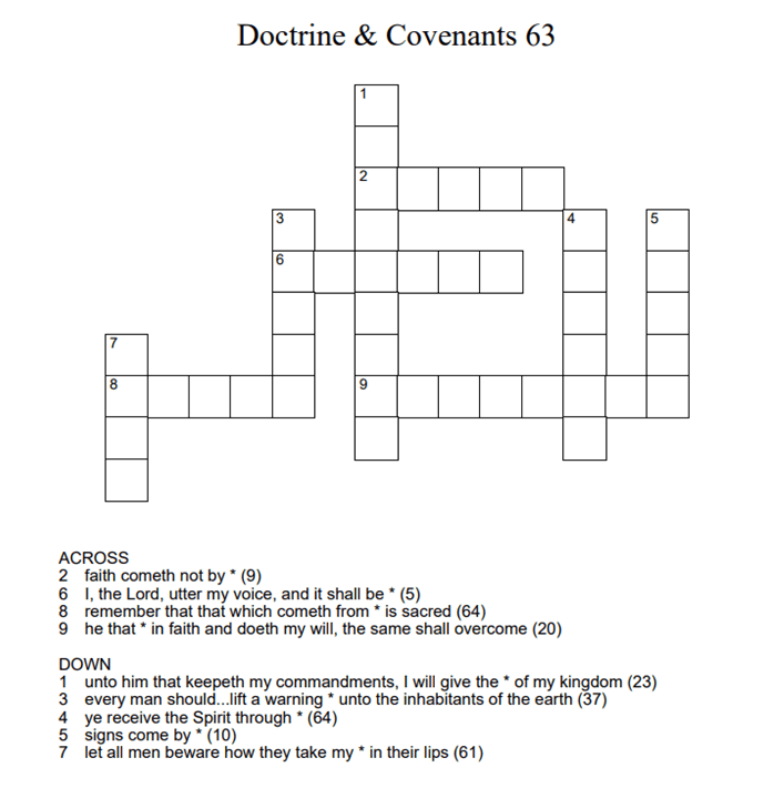 Doctrine & Covenants 63 0 June 13, 2021 Written by Kristi Click on the link below to download the crossword. The numbers at the end of each hint indicate the chapter and verse in which the answer can be found. dc63Download Share this: Share on X (Opens in new window) X Share on Facebook (Opens in new window) Facebook Like Loading... Related