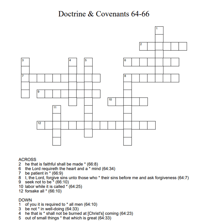 Doctrine & Covenants 64-66 0 June 13, 2021 Written by Kristi Click on the link below to download the crossword. The numbers at the end of each hint indicate the chapter and verse in which the answer can be found. dc64_66Download Share this: Share on X (Opens in new window) X Share on Facebook (Opens in new window) Facebook Like Loading... Related