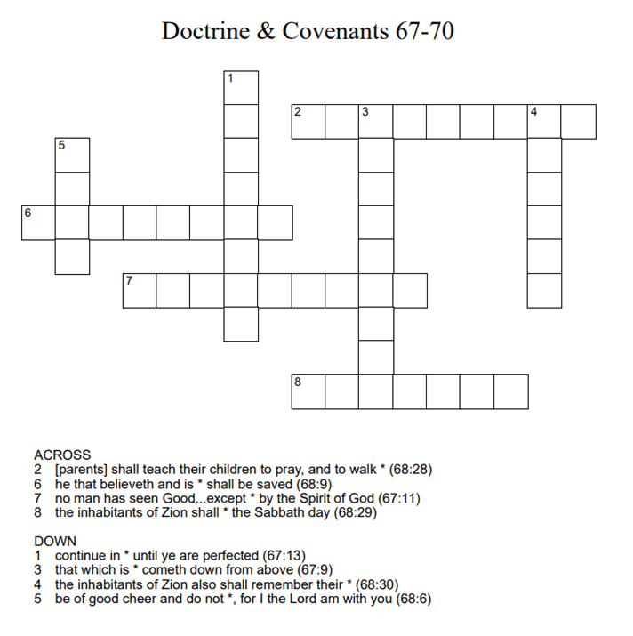 Doctrine & Covenants 67-70 0 June 27, 2021 Written by Kristi Click on the link below to download the crossword. The numbers at the end of each hint indicate the chapter and verse in which the answer can be found. dc67_70Download Share this: Share on X (Opens in new window) X Share on Facebook (Opens in new window) Facebook Like Loading... Related