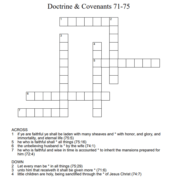 Doctrine & Covenants 71-75 0 June 27, 2021 Written by Kristi Click on the link below to download the crossword. The numbers at the end of each hint indicate the chapter and verse in which the answer can be found. dc71_75Download Share this: Share on X (Opens in new window) X Share on Facebook (Opens in new window) Facebook Like Loading... Related