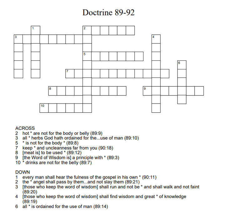 Doctrine & Covenants 89-92 0 August 15, 2021 Written by Kristi Click on the link below to download the crossword. The numbers at the end of each hint indicate the chapter and verse in which the answer can be found. dc89_92Download Share this: Share on X (Opens in new window) X Share on Facebook (Opens in new window) Facebook Like Loading... Related
