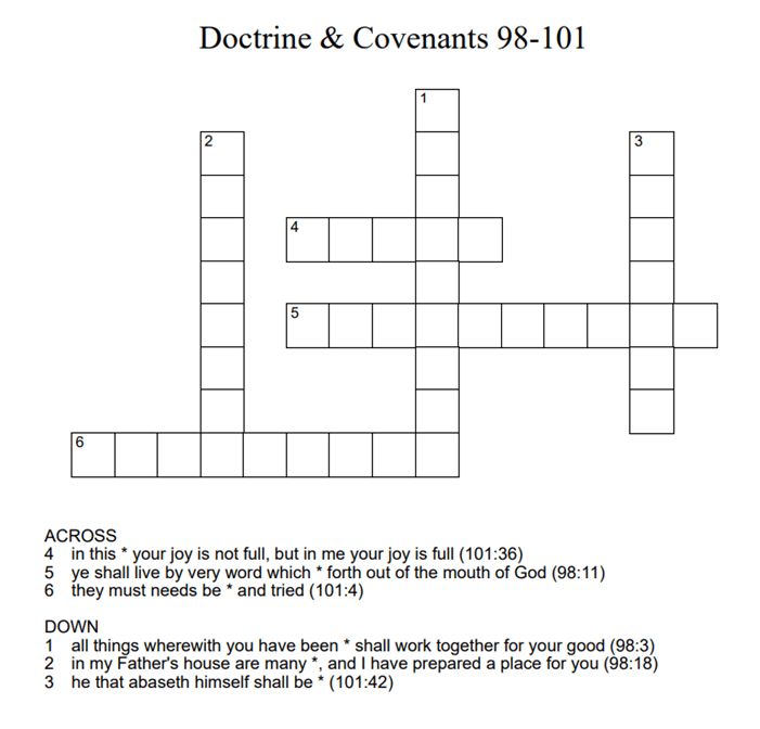 Doctrine & Covenants 98-101 0 September 5, 2021 Written by Kristi Click on the link below to download the crossword. The numbers at the end of each hint indicate the chapter and verse in which the answer can be found. dc98_101Download Share this: Share on X (Opens in new window) X Share on Facebook (Opens in new window) Facebook Like Loading... Related