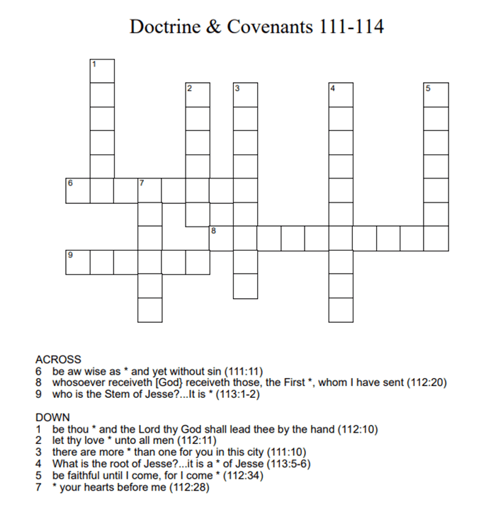 Doctrine & Covenants 111-114 0 October 3, 2021 Written by Kristi Click on the link below to download the crossword. The numbers at the end of each hint indicate the chapter and verse in which the answer can be found. dc111_114Download Share this: Share on X (Opens in new window) X Share on Facebook (Opens in new window) Facebook Like Loading... Related