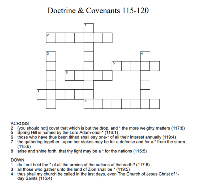 Doctrine & Covenants 115-120 0 October 14, 2021 Written by Kristi Click on the link below to download the crossword. The numbers at the end of each hint indicate the chapter and verse in which the answer can be found. dc115_120Download Share this: Share on X (Opens in new window) X Share on Facebook (Opens in new window) Facebook Like Loading... Related