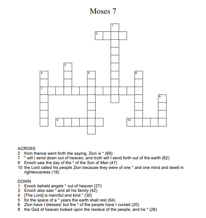 Moses 7 0 January 23, 2022April 2, 2023 Written by Kristi Click on the link below to download the crossword. The numbers at the end of each hint indicate the chapter and verse in which the answer can be found. moses-7Download Share this: Share on X (Opens in new window) X Share on Facebook (Opens in new window) Facebook Like Loading... Related