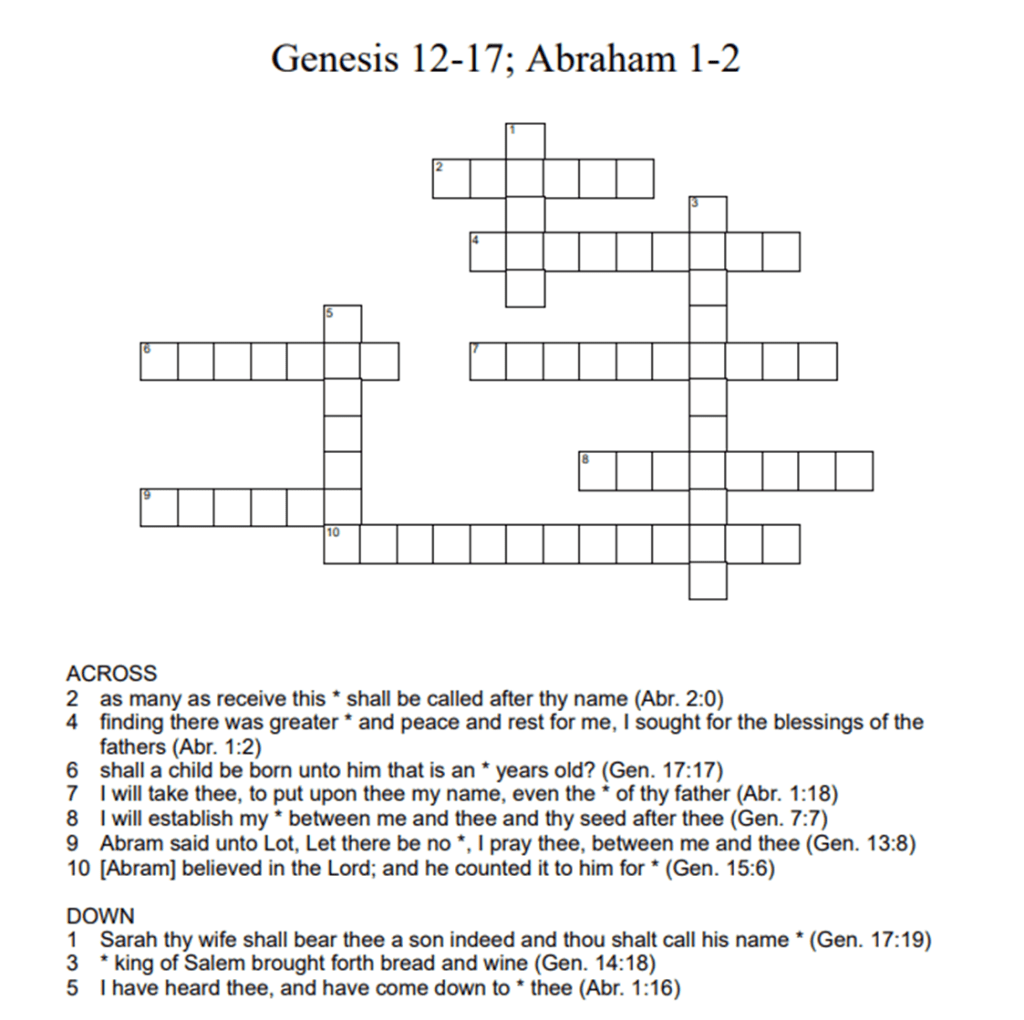 Genesis 12-17; Abraham 1-2 0 February 6, 2022April 2, 2023 Written by Kristi Click on the link below to download the crossword. The numbers at the end of each hint indicate the chapter and verse in which the answer can be found. gen12-17Download gen12-17Download Share this: Share on X (Opens in new window) X Share on Facebook (Opens in new window) Facebook Like Loading... Related